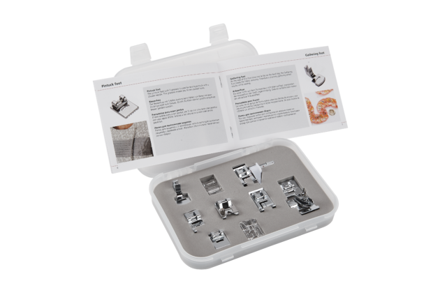 This set for the sewing machines b05 CRAFTER and b05 ACADEMY contains the following 9 presser feet for special stitches and decorative projects: